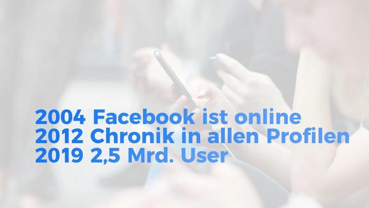 Facebook ging 2004 an den Start. Mark Zuckerberg stellte den Prototyp thefacebook für Student*innen online. Nach einigen Finanzspritzen öffnete das Portal auch für High-School-Schüler*innen. Es folgten Netzwerke für Angestellte. Erst 2006 öffnete sich die Plattform der Allgemeinheit – das war die Geburtsstunde von Facebook, wie wir es heute kennen.