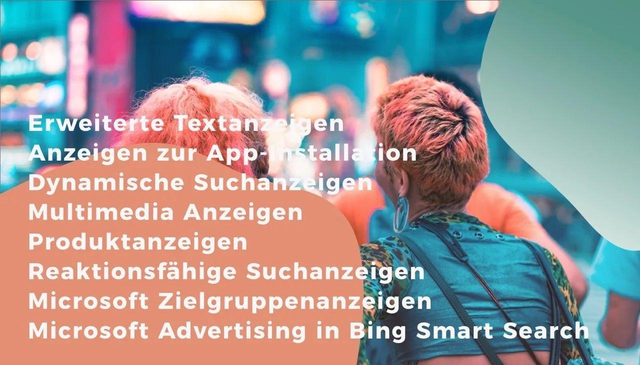Grundsätzlich besteht eine Ads Kampagne auf Bing aus einer Anzeigengruppe. In dieser Gruppe befinden sich eine oder mehrere Anzeigen inklusive Keywords. Bei den Anzeigentypen stellt Bing Dir diese acht Varianten zur Verfügung: