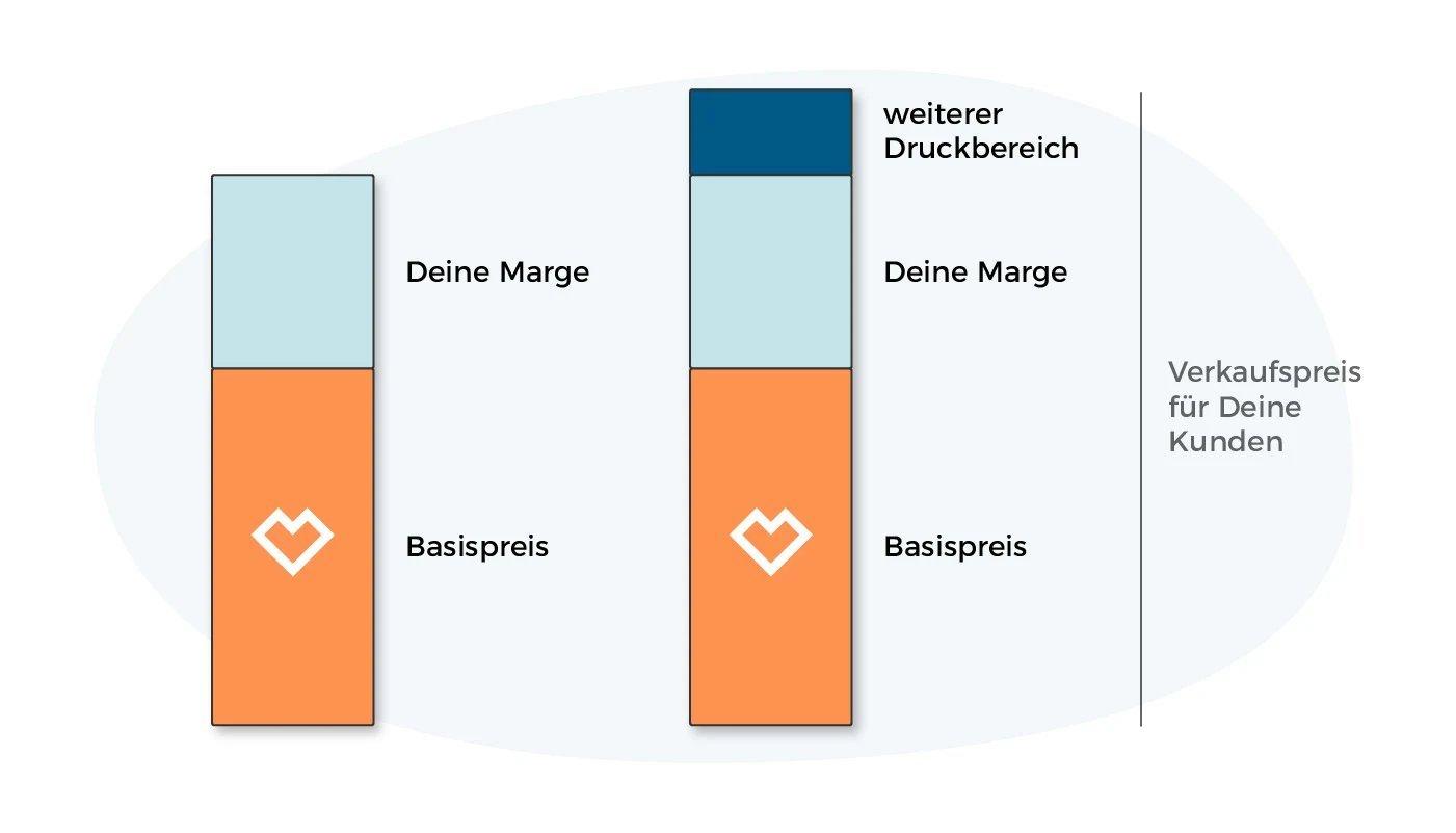 Deine Marge bleibt unverändert, da sie weiterhin auf Basis des regulären Kundenpreises ohne Zusatzdrucke berechnet wird.